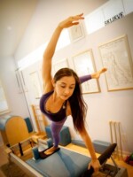 The Reformer apparatus is the fundamental Pilates apparatus. Along with the Matwork, it forms the heart and soul of the Pilates system. All Reformer workouts start out with the student lying down with the head supported in a headrest and feet supported on a foot bar, thus “cradling” the body. Although the carriage just slides back and forth, postures on the Reformer vary from lying down, sitting, kneeling and standing. Using up to four springs for resistance, students are constantly lengthening and strengthening their muscles while exercising control over the springs.