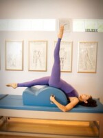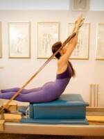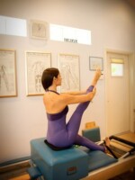 The Reformer apparatus is the fundamental Pilates apparatus. Along with the Matwork, it forms the heart and soul of the Pilates system. All Reformer workouts start out with the student lying down with the head supported in a headrest and feet supported on a foot bar, thus “cradling” the body. Although the carriage just slides back and forth, postures on the Reformer vary from lying down, sitting, kneeling and standing. Using up to four springs for resistance, students are constantly lengthening and strengthening their muscles while exercising control over the springs.